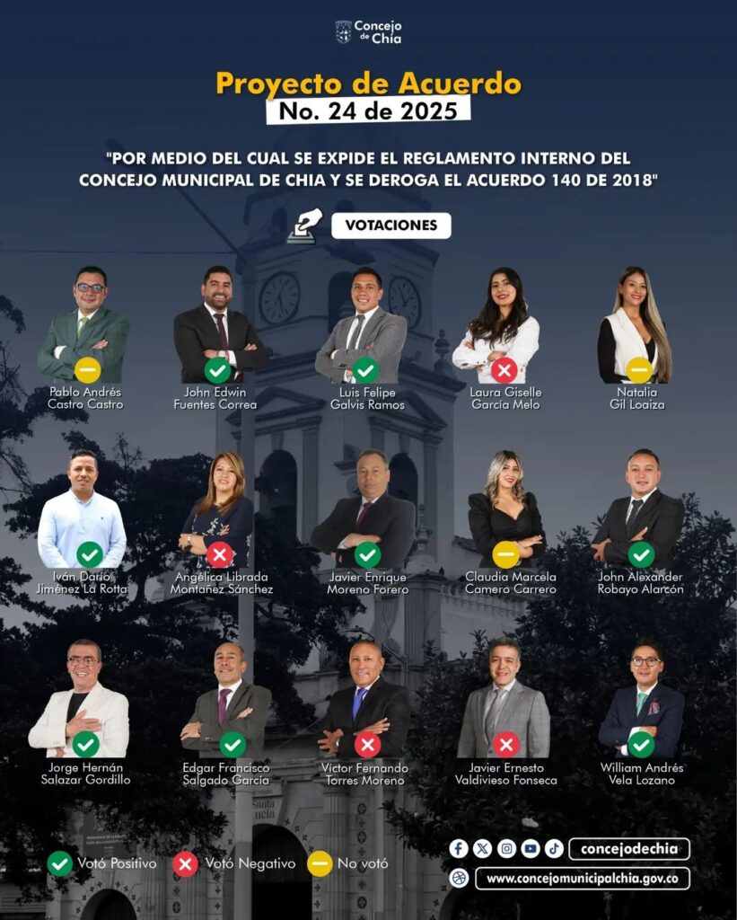 En sesión plenaria realizada el 22 de diciembre, el Concejo Municipal de Chía aprobó con ocho votos positivos el Proyecto de Acuerdo No. 24 de 2025, mediante el cual se expide el nuevo Reglamento Interno de la corporación y se deroga el Acuerdo 140 de 2018. La iniciativa fue presentada por el concejal Luis Felipe Galvis Ramos, quien actuó como ponente del proyecto.