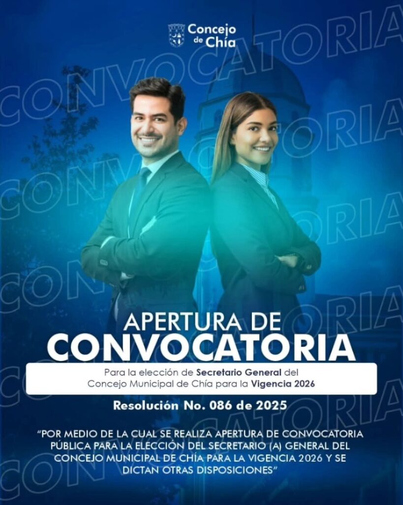 El Concejo Municipal de Chía informa a la comunidad en general que se encuentra abierta la convocatoria pública para la elección del Secretario(a) General de la Corporación, correspondiente a la vigencia del año 2026.
