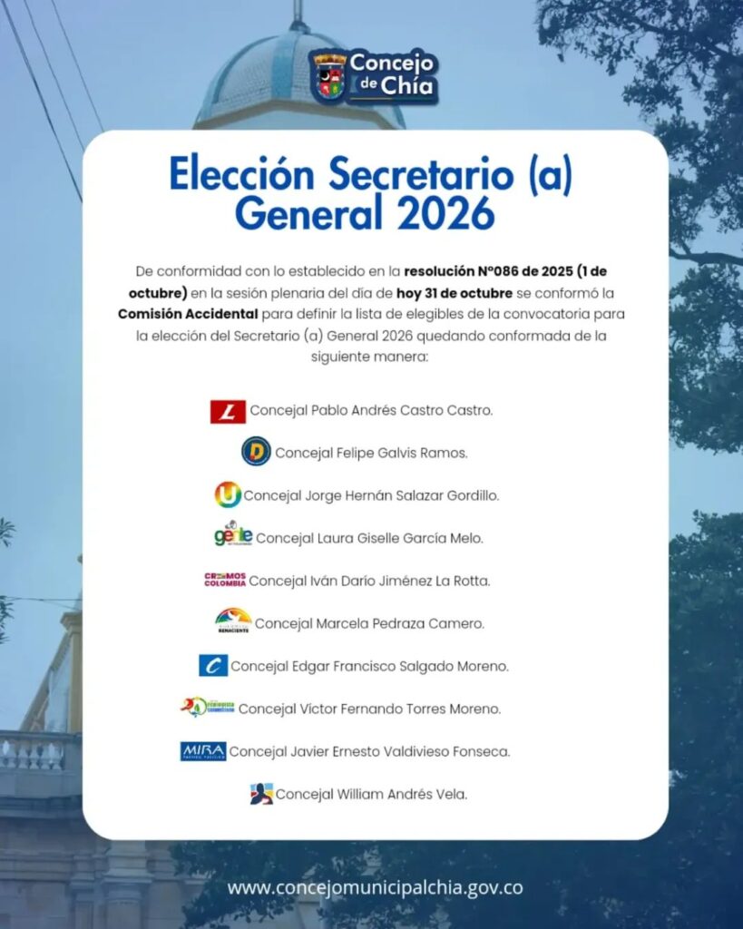 En cumplimiento de la Resolución N.º 086 del 1 de octubre de 2025, durante la sesión plenaria del 31 de octubre, el Concejo Municipal de Chía conformó la Comisión Accidental encargada de definir la lista de elegibles dentro del proceso de convocatoria para la elección del Secretario(a) General 2026, quedando integrada de la siguiente manera: