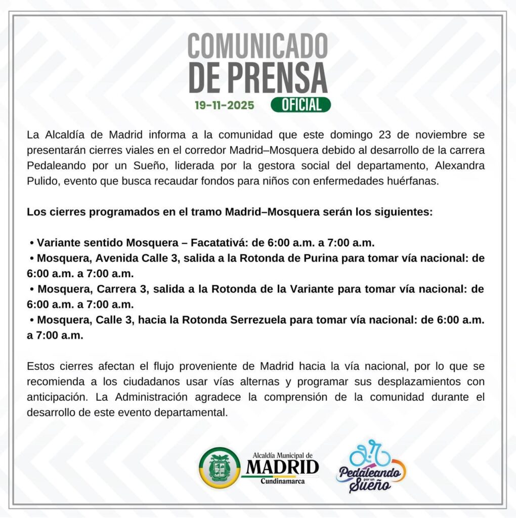 La Alcaldía de Madrid informa a la ciudadanía que el próximo domingo 23 de noviembre habrá cierres viales temporales en el corredor Madrid–Mosquera, con motivo del desarrollo de la carrera “Pedaleando por un Sueño”, liderada por la gestora social del departamento, Alexandra Pulido. Este evento deportivo tiene como propósito recaudar fondos para apoyar a niños con enfermedades huérfanas.